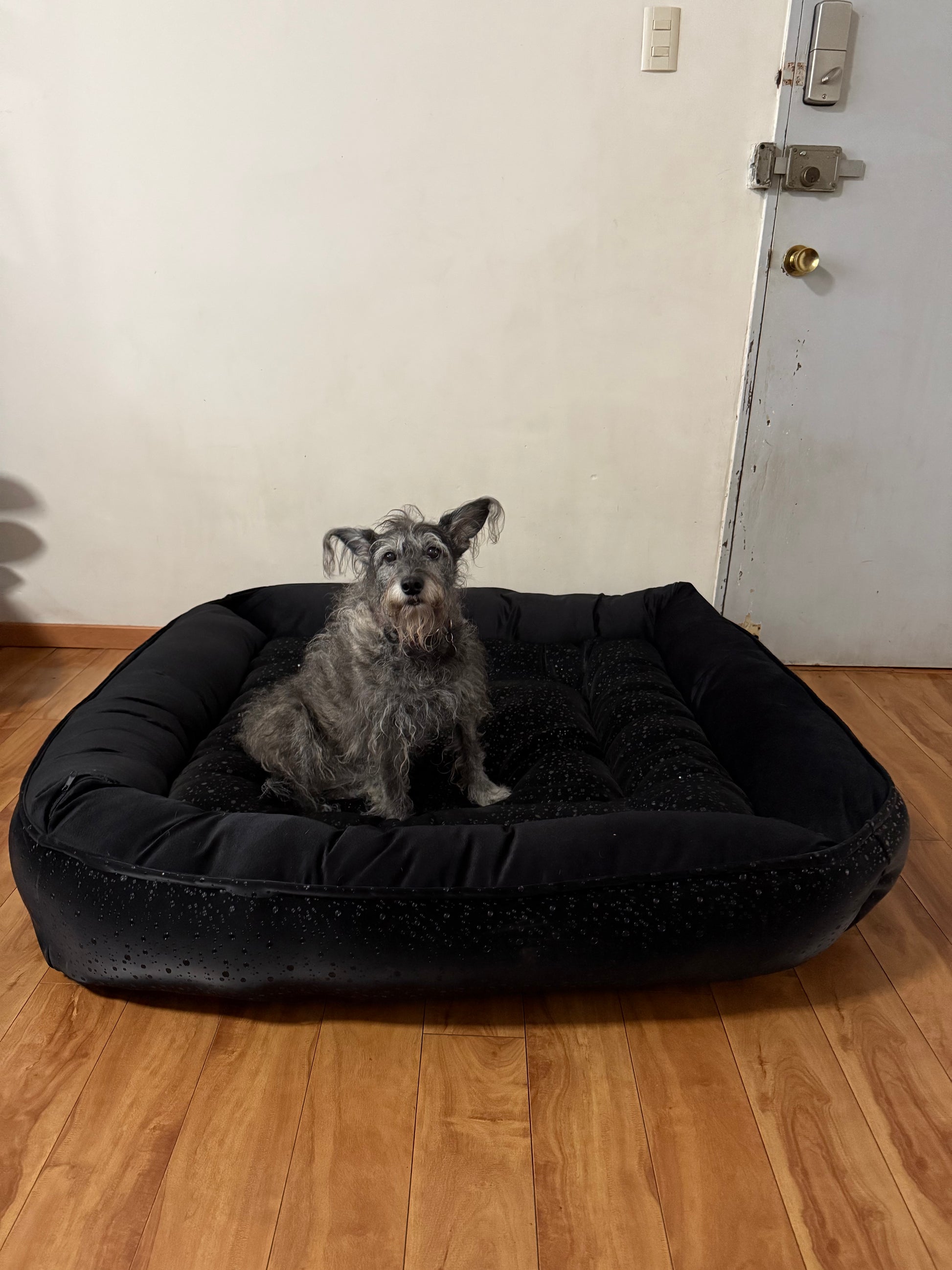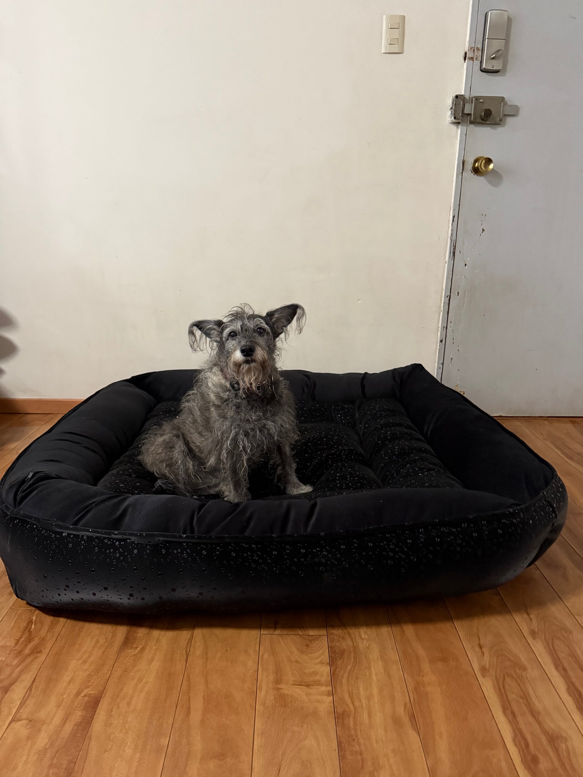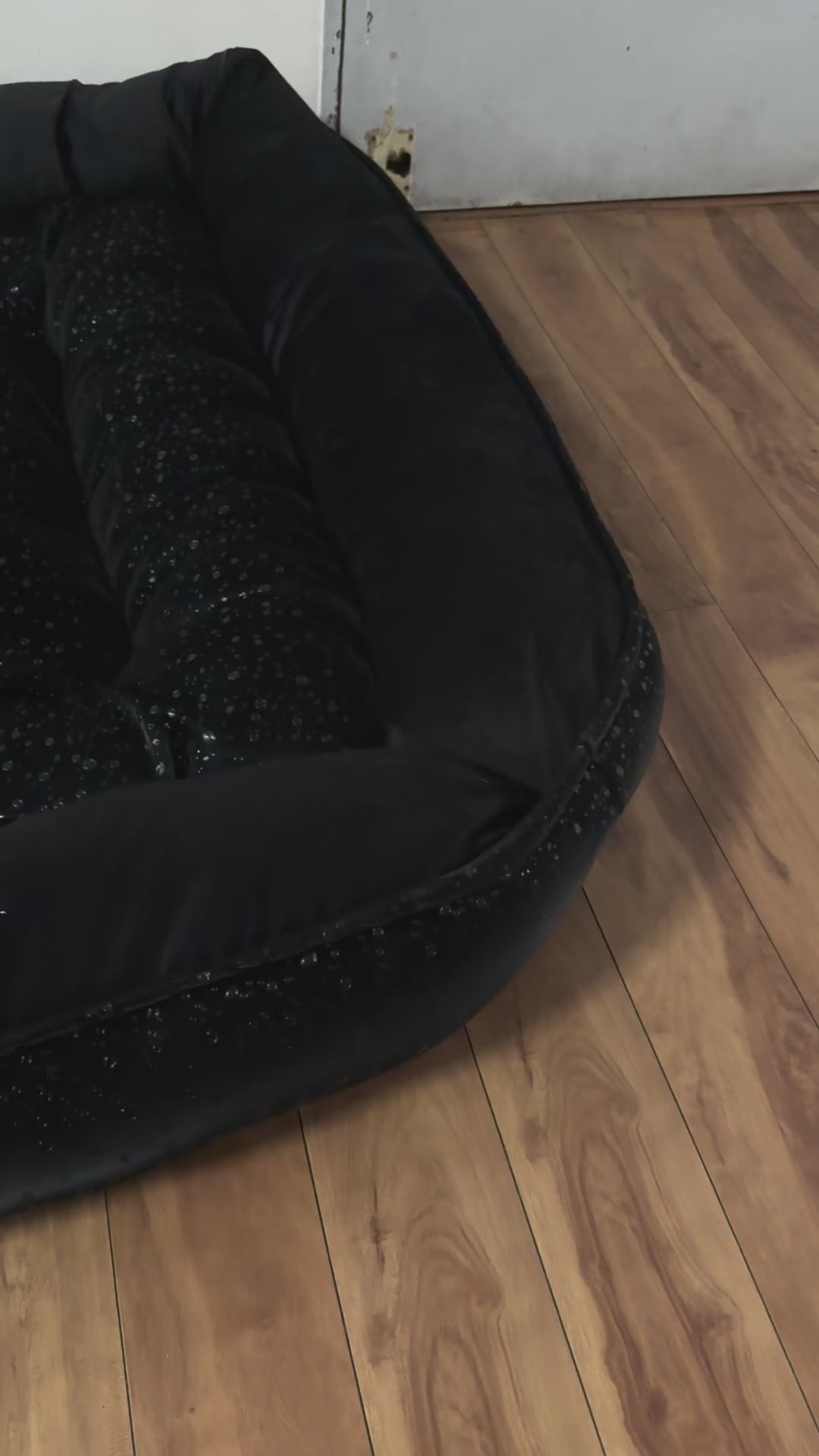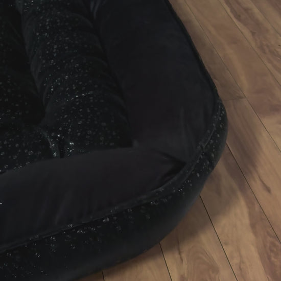 Cama gigante negra con borde y con estampado como de gotas de agua. Dimensiones 130 x 100 x 15 cm.
