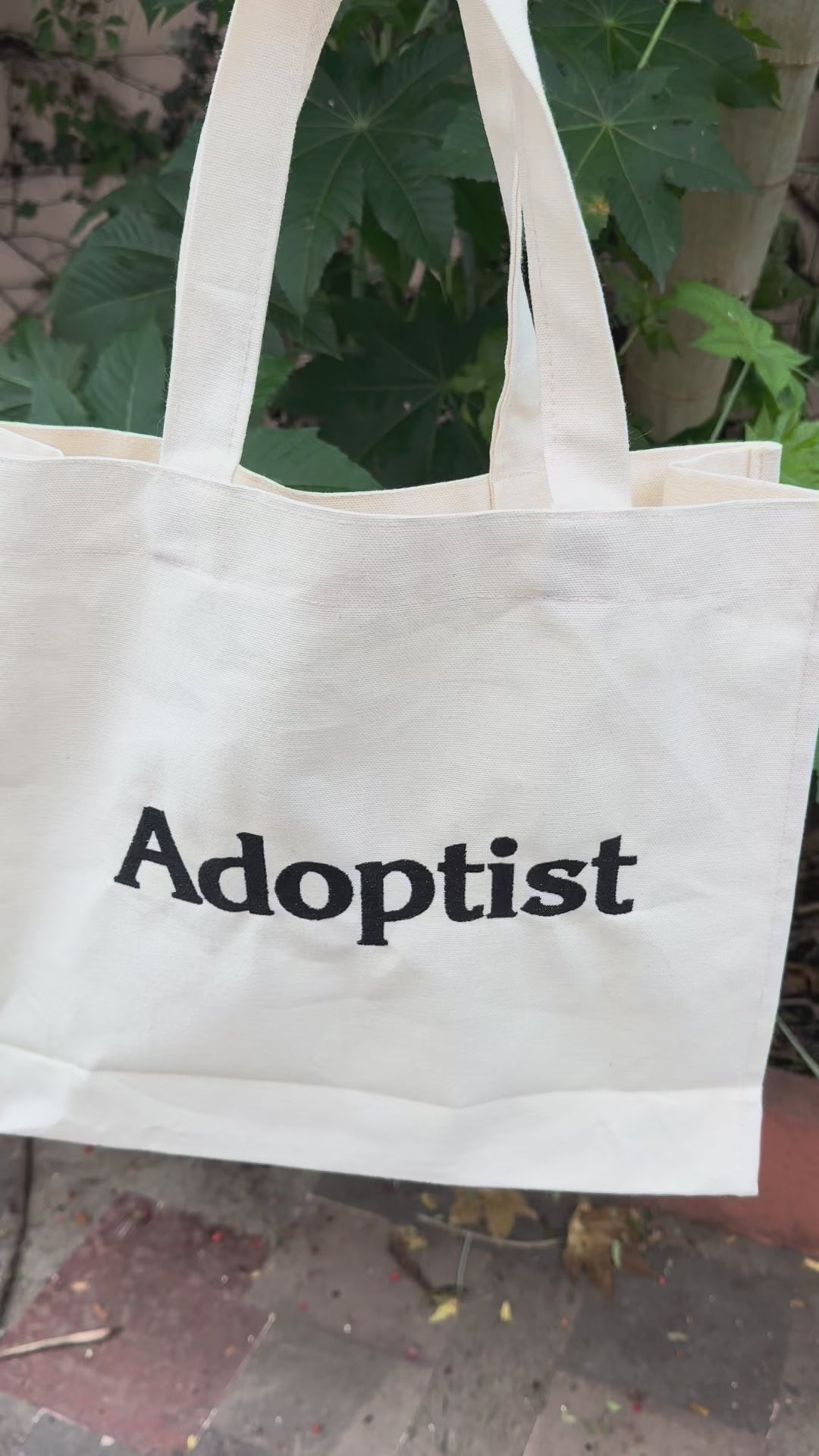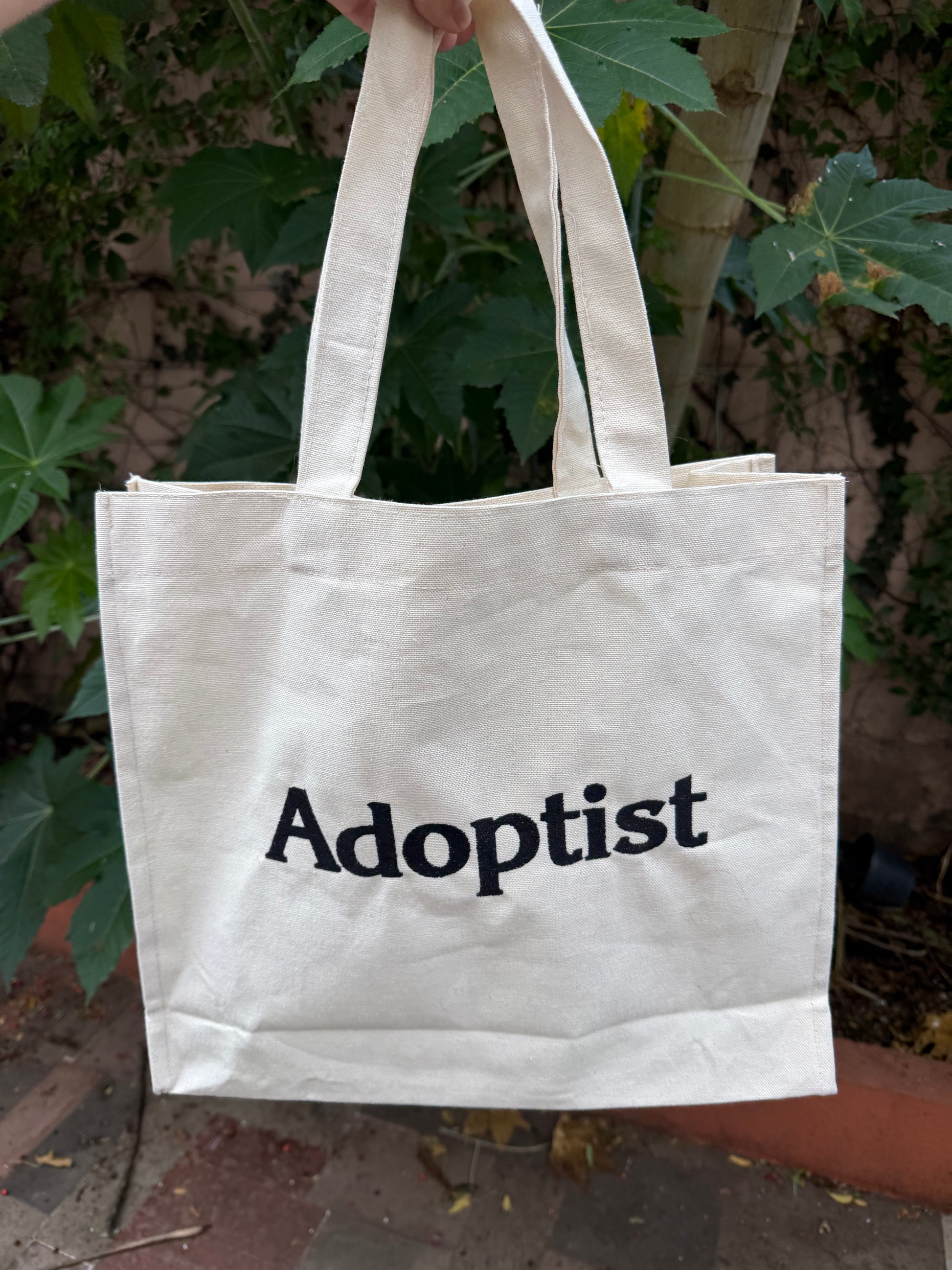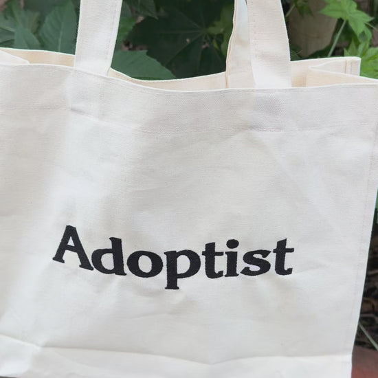 Tote bag de manta con bordado de Adoptist en negro.